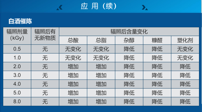 白酒经辐照后,水分子和有机化合物分子产生电离和激发,从而产生大量活性较高的自由基和分子产物,这些产物既有氧化剂又有还原剂,使引进杂味的物质,改变固有化学性质,降低了白酒中固有的有害成分,增加了有益成分,使得酒质变得更为醇和,提升酒品的综合品质。