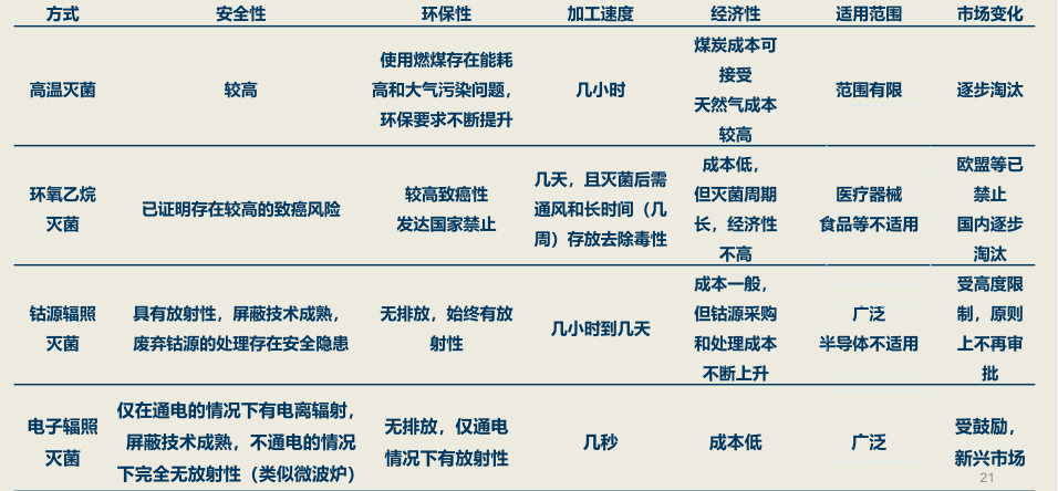 目前医疗卫生材料主要有以下几种灭菌方式:高温灭菌、环氧乙烷灭菌、钴源辐照灭菌及电子辐照灭菌等。其他灭菌方式由于环保、安全性等问题,已逐步被市场淘汰,电子束辐照灭菌是未来的发展方向。